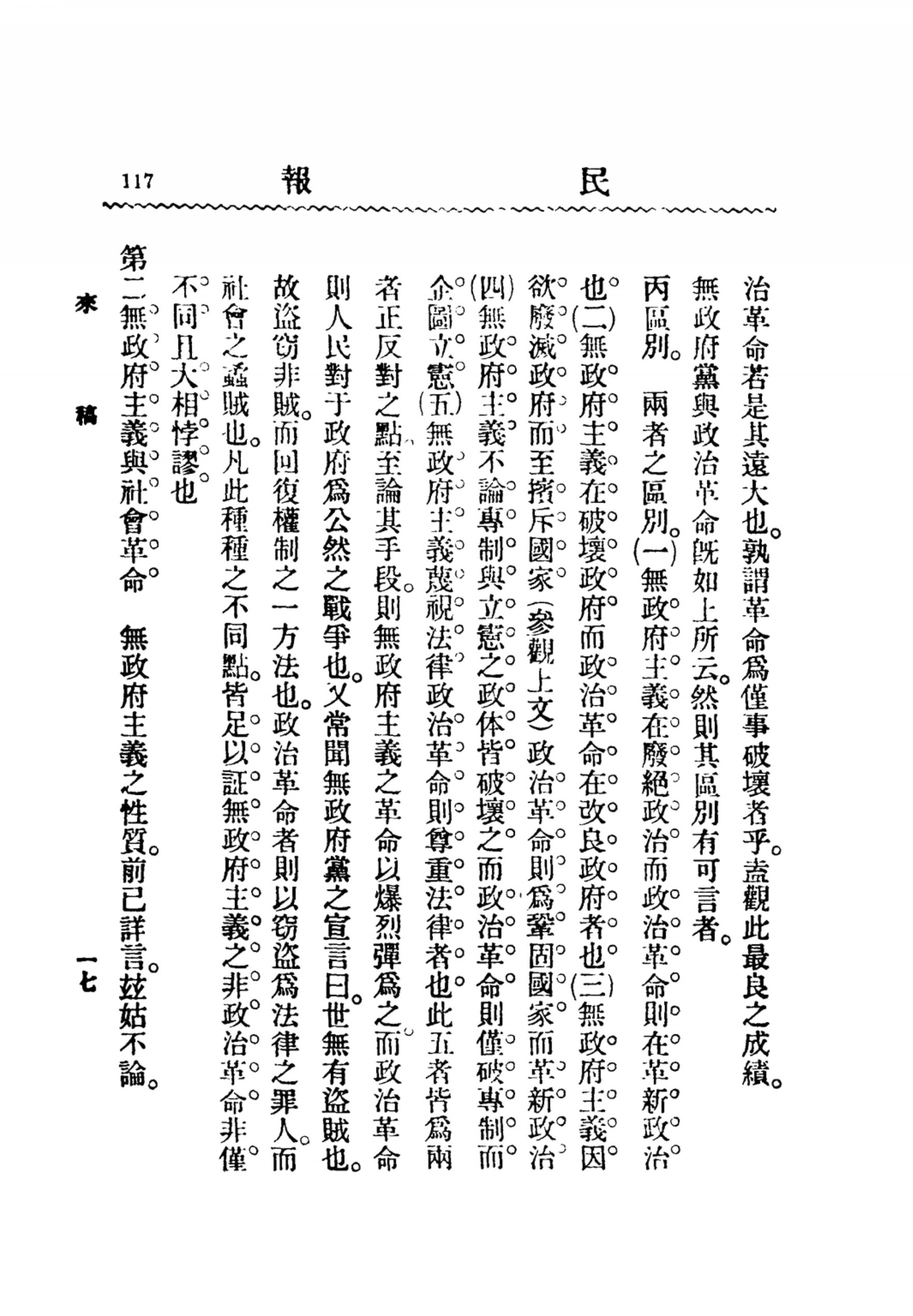 吾闻之人言曰:“有政府胜于无政府。”斯言也,实保皇党借以诋革命党所主张为无政府主义而欲以惑人也。于是乎怵革命者咸以为口实,乃误认革命即无政府主义。夫无政府党与革命党其主张不能两立,此有识者所能知。然则其为是言亦惑愚昧者耳,余又何喋之为?虽然余不能不辩也。夫一说之存,苟足以惑一人者,即其言可流毒社会,况此说乃似是而非者耶?方今言政治革命与社会革命并行,彼社会主义与无政府主义罕有能知其区别者。故苟闻社会主义之说,必将望而去之,以为社会主义之实行、国家之安宁与社会之秩序,必将尽倾覆而无遗。其与无政府主义之破坏说无以异,误认此理由则其信有政府胜无政府之说愈坚,斯其怵革命也愈甚。无他,有无政府主义之观念,而无政治革命、社会革命之观念耳。然则无政府革命主义与政治革命、社会革命,诚不可以无别也。