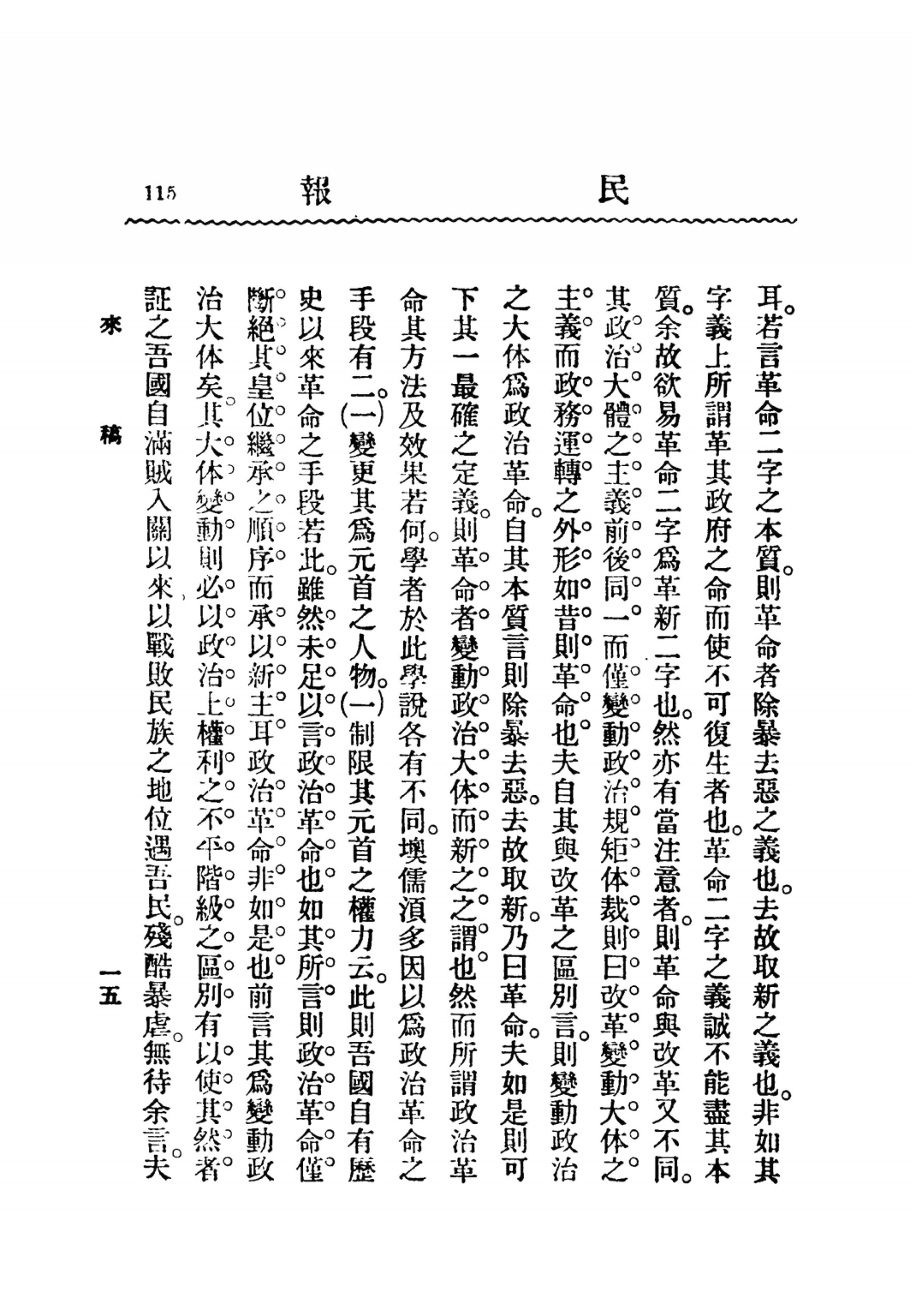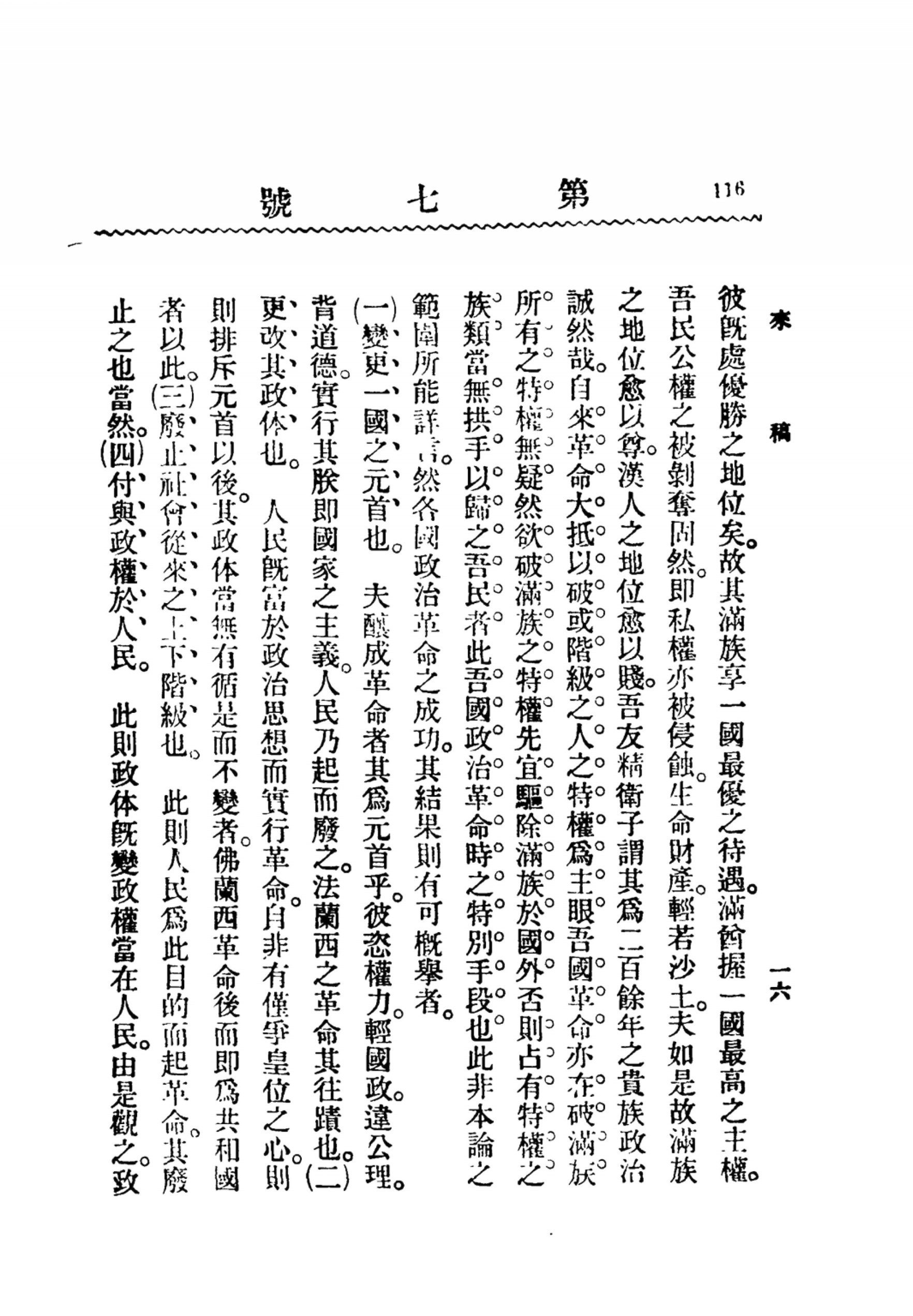 乙、政治革命。然则无政府主义之革命,既非革命矣。政治革命者何耶?冰儒李芭之言:革命者,以急激变革政府根源之主义也。此但就政治革命之外形上言耳。若言“革命”二字之本质,则革命者除暴去恶之义也,去故取新之义也,非如其字义上所谓革其政府之命而使不可复生者也。“革命”二字之义诚不能尽其本质,余故欲易“革命”二字为“革新”二字也。然亦有当注意者,则革命与改革又不同。其政治大体之主义前后同一,而仅变动政治规矩体裁则曰改革,变动大体之主义而政务运转之外形如昔则革命也。夫自其与改革之区别言,则变动政治之大体为政治革命;自其本质言,则除暴去恶,去故取新,乃曰革命。夫如是,则可下其一最确之定义。则革命者,变动政治大体而新之之谓也。然而所谓政治革命其方法及效果若何?学者于此学说各有不同。墺儒须多因以为政治革命之手段有二:(一)变更其为元首之人物;(一)制限其元首之权力云。此则吾国自有历史以来革命之手段若此。虽然,未足以言政治革命也。如其所言,则政治革命仅断绝其皇位继承之顺序,而承以新主耳。政治革命非如是也,前言其为变动政治大体矣。其大体变动,则必以政治上权利之不平阶级之区别,有以使其然者。证之吾国自满贼入关以来,以战败民族之地位遇吾民,残酷暴虐,无待余言。夫彼既处优胜之地位矣,故其满族享一国最优之待遇,满酋握一国最高之主权。吾民公权之被剥夺固然,即私权亦被侵蚀,生命财产,轻若沙土。夫如是,故满族之地位愈以尊,汉人之地位愈以贱。吾友精卫子谓其为二百余年之贵族政治,诚然哉!自来革命大抵以破或阶级之人之特权为主眼,吾国革命亦在破满族所有之特权无疑。然欲破满族之特权,先宜驱除满族于国外。否则,占有特权之族类当无拱手以归之吾民者,此吾国政治革命时之特别手段也。此非本论之范围所能详言。然各国政治革命之成功,其结果则有可概举者。