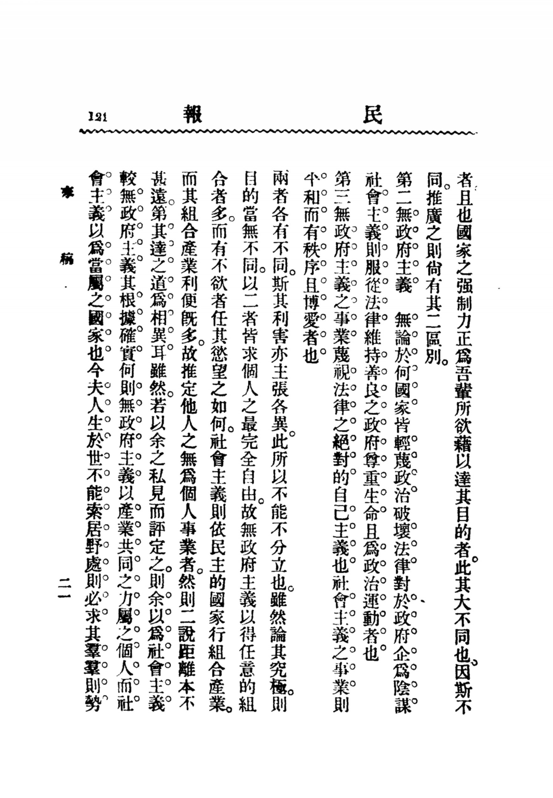 第一,无政府主义在废灭政府,而社会主义则在利用政府也。盖无政府主义以国家具强制力,则侵略人民之自由;社会主义则以为国家无有不具强制力者,且也国家之强制力正为吾辈所欲借以达其目的者。此其大不同也。因斯不同,推广之则尚有其二区别。