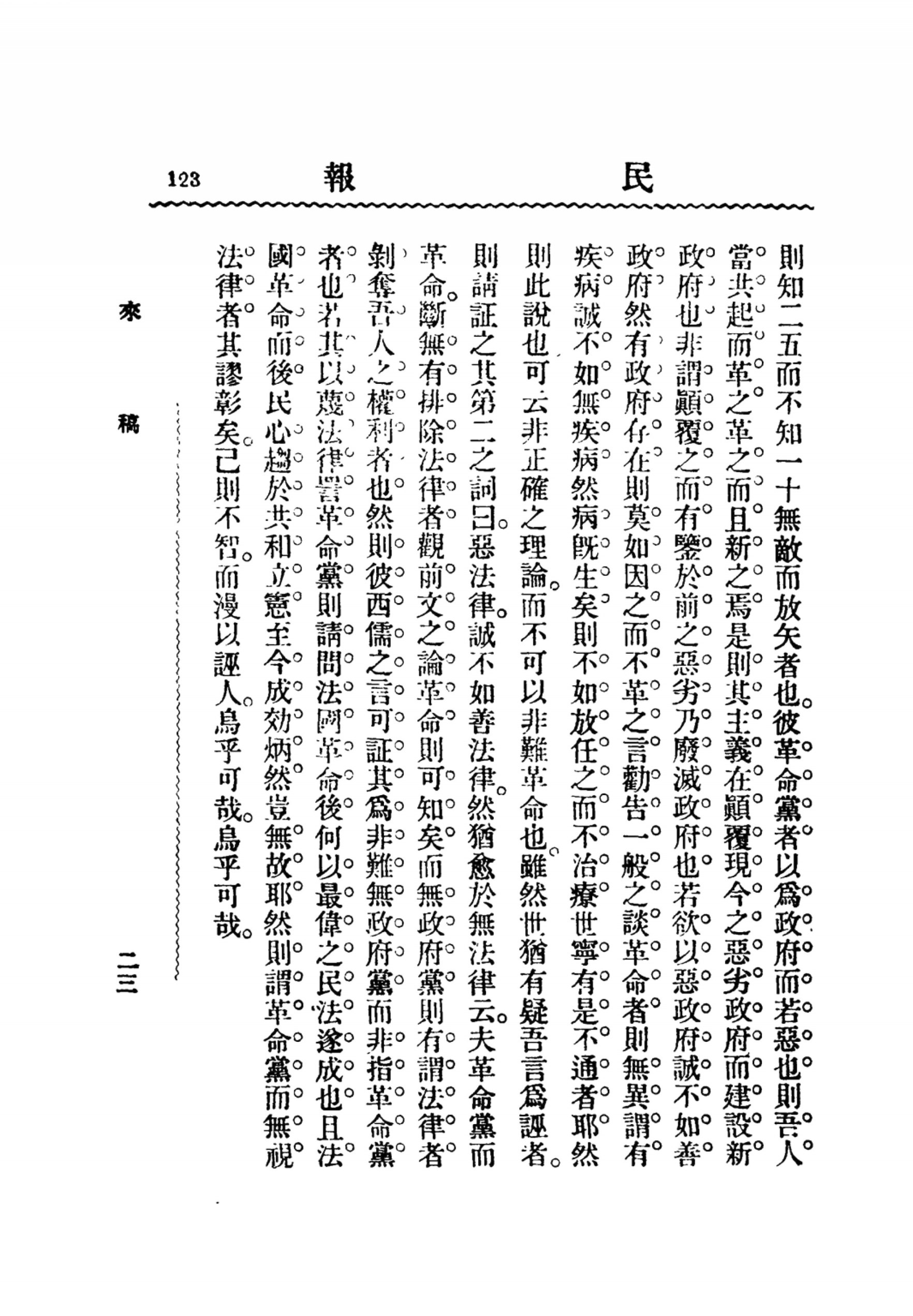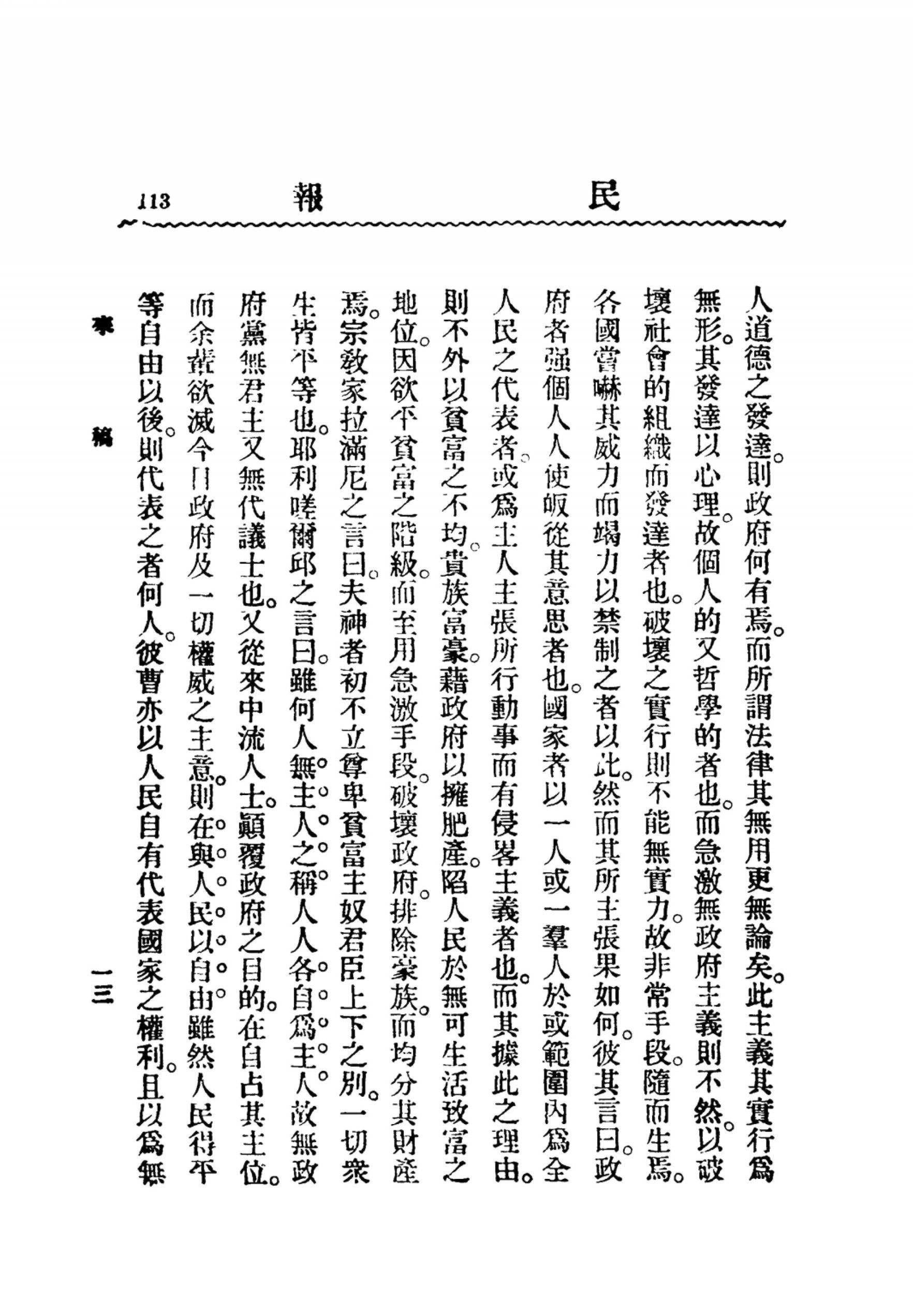 梦蝶生曰:“嗟乎!余为此论讫,而有不能已于言者矣。某报有论人格者曰:西儒之言曰‘恶政府诚不如善政府,然犹愈于无政府;恶法律诚不如善法律,然犹愈于无法律’云,彼西儒之为是言也,乃对无政府党而加非难者也。彼无政府党重个人而轻政府,恶政府而欲废绝之,其有激而为是言,诚不能谓不当者。若以此言而诋革命,则知二五而不知一十无敌而放矢者也。彼革命党者,以为政府而若恶也,则吾人当共起而革之,革之而且新之焉。是则其主义在颠覆现今之恶劣政府而建设新政府也,非谓颠覆之而有鉴于前之恶劣乃废灭政府也。若欲以恶政府诚不如善政府,然有政府存在,则莫如因之而不革之言劝告一般之谈革命者,则无异谓有疾病诚不如无疾病。然病既生矣,则不如放任之而不治疗。世宁有是不通者耶?然则此说也,可云非正确之理论,而不可以非难革命也。虽然世犹有疑吾言为诬者,则请证之其第二之词曰‘恶法律,诚不如善法律,然犹愈于无法律’云。夫革命党而革命,断无有排除法律者,观前文之论革命,则可知矣。而无政府党则有谓‘法律者,剥夺吾人之权利者也’。然则彼西儒之言可证其为非难无政府党,而非指革命党者也。若其以蔑法律詈革命党,则请问法国革命后,何以最伟之民法遂成也?且法国革命而后,民心趋于共和立宪,至今成效炳然,岂无故耶?然则谓革命党而无视法律者,其谬彰矣。己则不智,而漫以诬人,乌乎可哉?乌乎可哉?”
