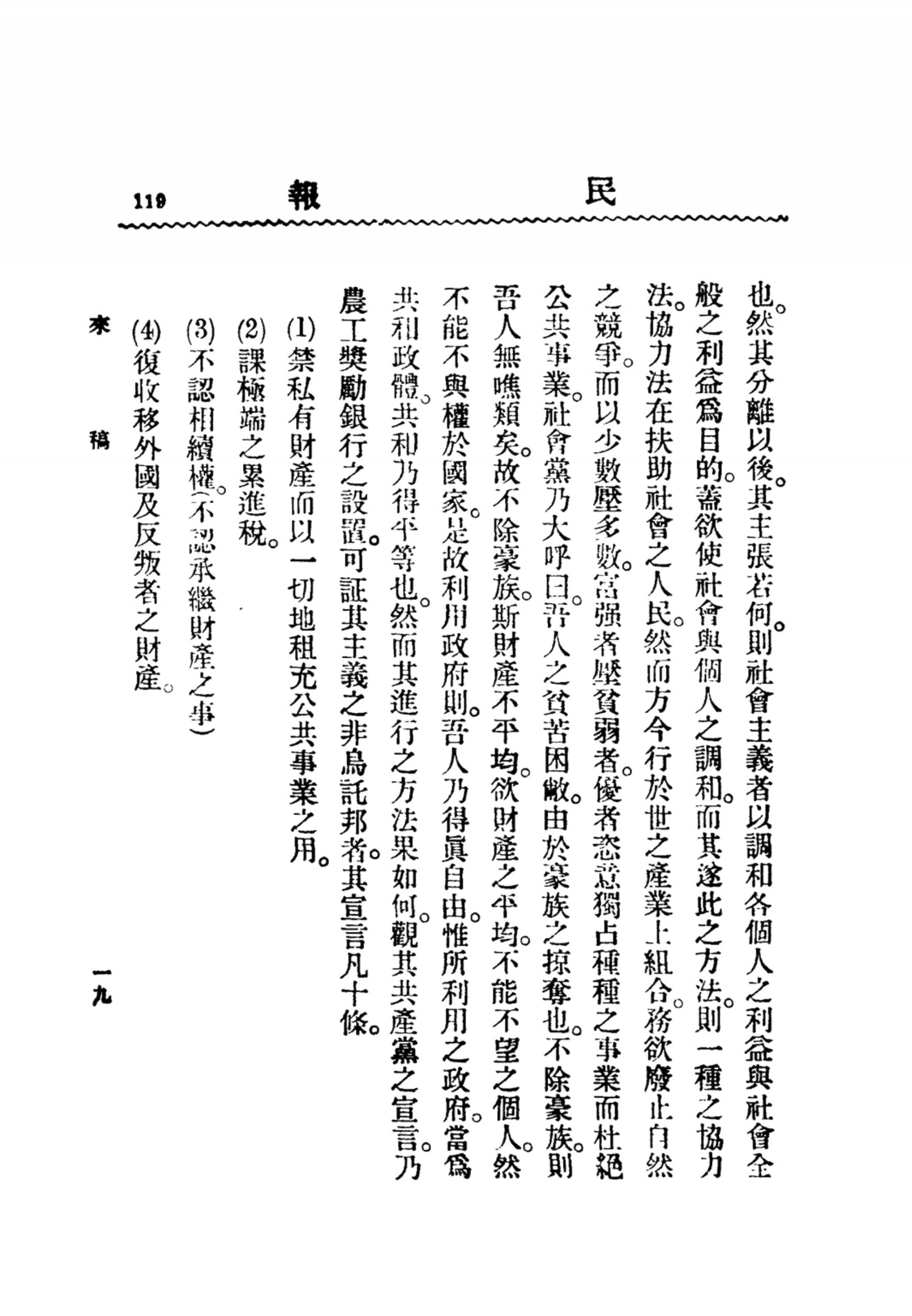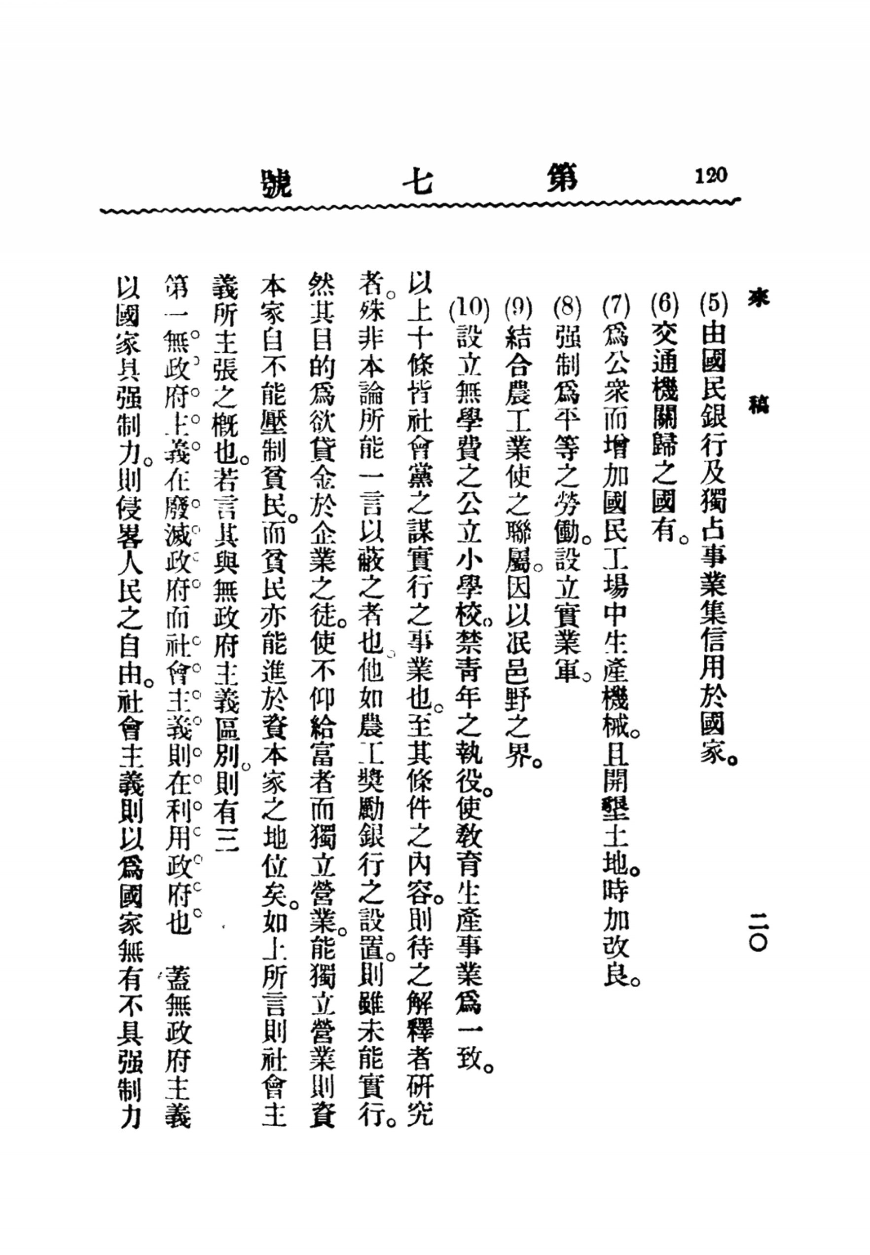 以上十条皆社会党之谋实行之事业也。至其条件之内容,则待之解释者、研究者,殊非本论所能一言以蔽之者也。他如农工奖励银行之设置,则虽未能实行,然其目的为欲贷金于企业之徒,使不仰给富者而独立营业,能独立营业则资本家自不能压制贫民,而贫民亦能进于资本家之地位矣。如上所言,则社会主义所主张之概也。若言其与无政府主义区别,则有三: