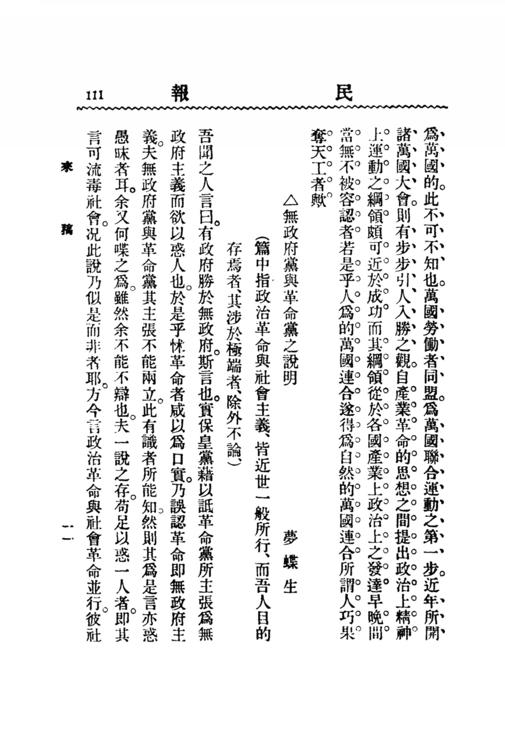 《无政府党与革命党之说明》刊载于1906年9月5日《民报》第七号,作者署名“梦蝶生”,即叶夏声。本文对资产阶级革命党的社会主义与无政府主义进行了区分,同时又援引《共产党宣言》中的十条纲领,以此说明社会主义之说并非乌托邦。