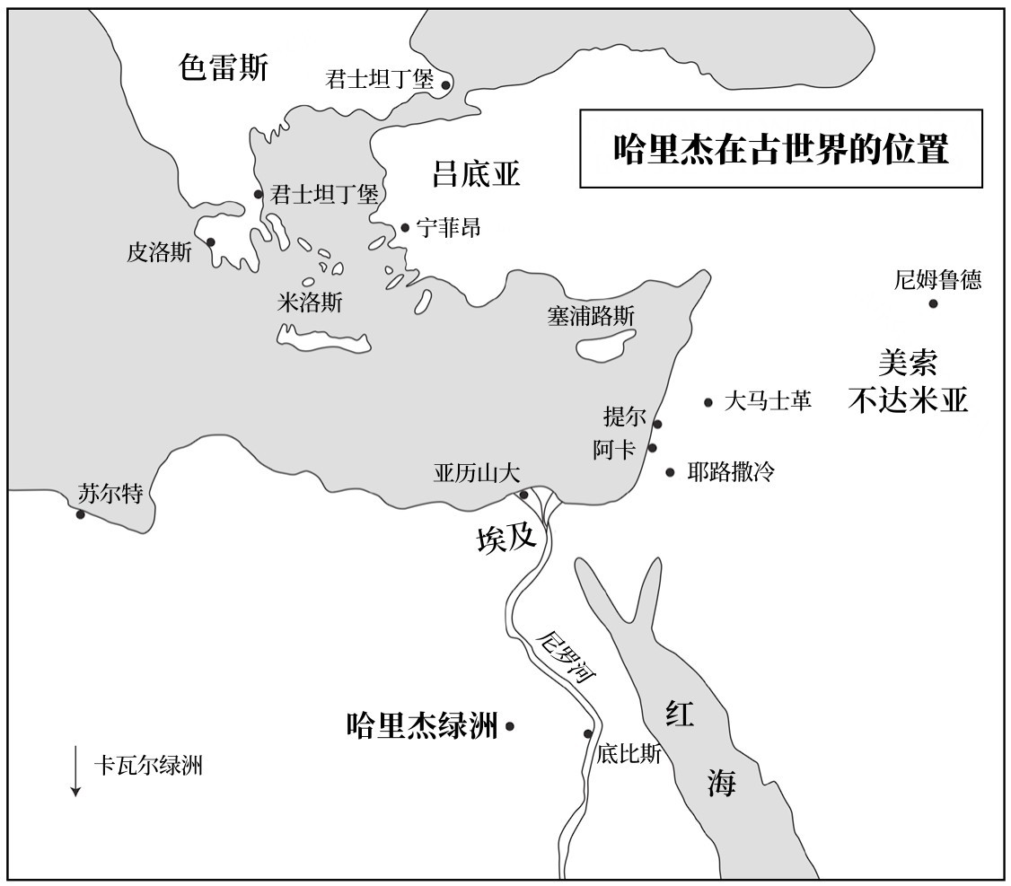 哈里杰绿洲位于埃及西部沙漠的深处,远离尼罗河,难以便捷地前往繁荣的波斯和美索不达米亚市场。其北、南、西三面均是数千英里极度干旱的土地,而东面则是约120英里的沙漠和高达千英尺的悬崖,将其与尼罗河谷的灌溉农田隔开。要是看一眼气象图的话你就会发现,6月时这里的气温通常高达50°C,而1月则会降至0°C。这样的环境似乎不太可能成为所谓“富饶的文化十字路口”。