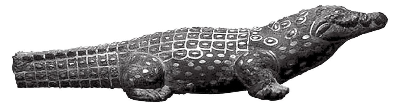 早在近4000年前,埃及工匠便将雕像浸入明矾、铜合金与醋的混合溶液中,赋予其深色金属光泽(氧化层),与抛光金银区域形成鲜明对比。这件藏于慕尼黑埃及艺术博物馆的鳄鱼雕像约制作于公元前1800年(来自维基共享资源)