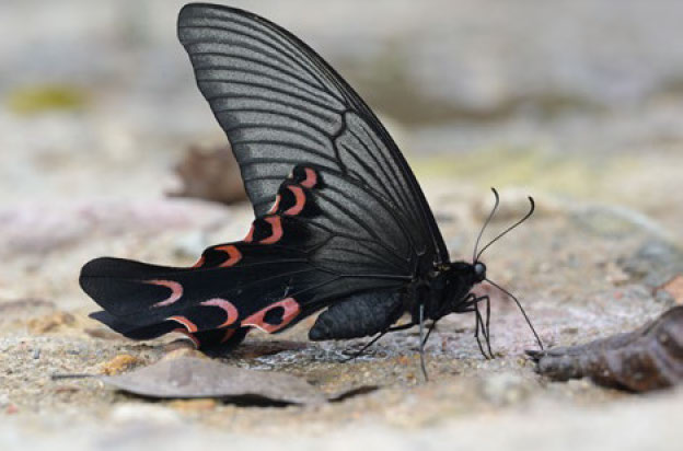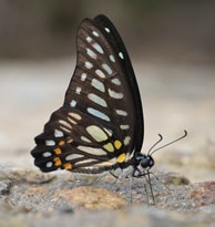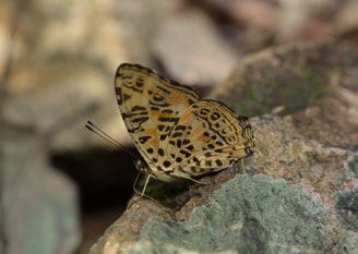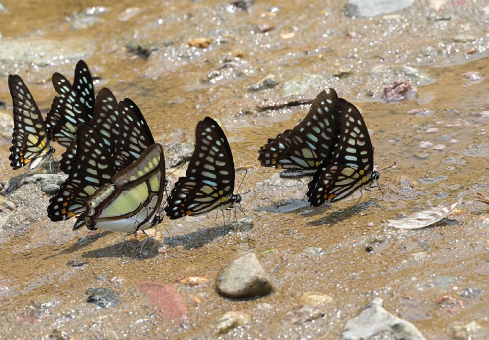 最初看到的是青凤蝶群,主要由碎斑青凤蝶、宽带青凤蝶构成,偶有一两只二尾蛱蝶。可能连接在一起的石头能传递震动,我还没靠近,敏感的青凤蝶已集体腾空而起,只剩下孤零零的二尾蛱蝶继续大大咧咧地吸食。