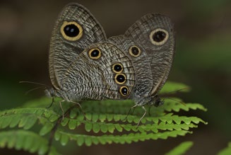 一对交尾的大波矍眼蝶,本来倒挂在蕨叶下,被竹竿惊动后,其动作协调一致地翻转到了叶面上,就懒得再动了。一只新鲜,眼斑醒目;一只旧暗,眼斑模糊。镜头里,是很协调的老少配。