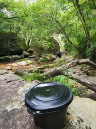肚子“咕咕”叫了起来,我只好继续往前走,往右钻进了一条小溪边,在溪畔享用自热饭,也顺便清凉一下。