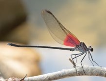 但此处除了流水,就只有树下一口小水潭,水潭边有几只二尾蛱蝶,我蹲下观赏着它们,逆光中偶然看到一只赤基色蟌,是雄性,那一小团红色,在黄色滩石中特别显眼。