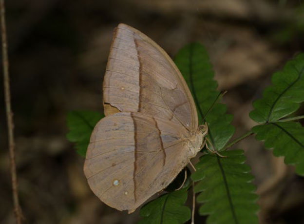 不远处,还有一只奥倍纹环蝶,一袭旧衣,超然地停在蕨叶上,似乎对几米外的红尘生活失去了兴趣,只顾沉浸在自己的回忆中。