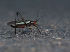 当我回到主路上,发现一只黛眼蝶很奇特,它的触角旁还有两根细长的丝线在舞动。我正在困惑,黛眼蝶飞走了,那两根细长的丝线还在原地。我好奇地凑近一看,忍不住笑了,一只螽斯正大摇大摆地横过公路,这是一只分布不算广的歧尾鼓鸣螽,刚才,它凑巧和蝴蝶的身影叠加在了一起。