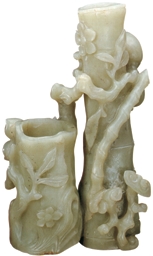 此图为一套象牙管提笔,大笔笔管较粗,笔管上端嵌有牛角,笔头为羊毫;小笔笔管较细,下接牛角笔斗羊毫笔头。两支笔均刻有“宇老上将军赏鉴”“湘阴龚英谨制”。从外观上看,这两支笔圆润洁白,羊毫柔顺,牛角润泽,为上乘之笔。