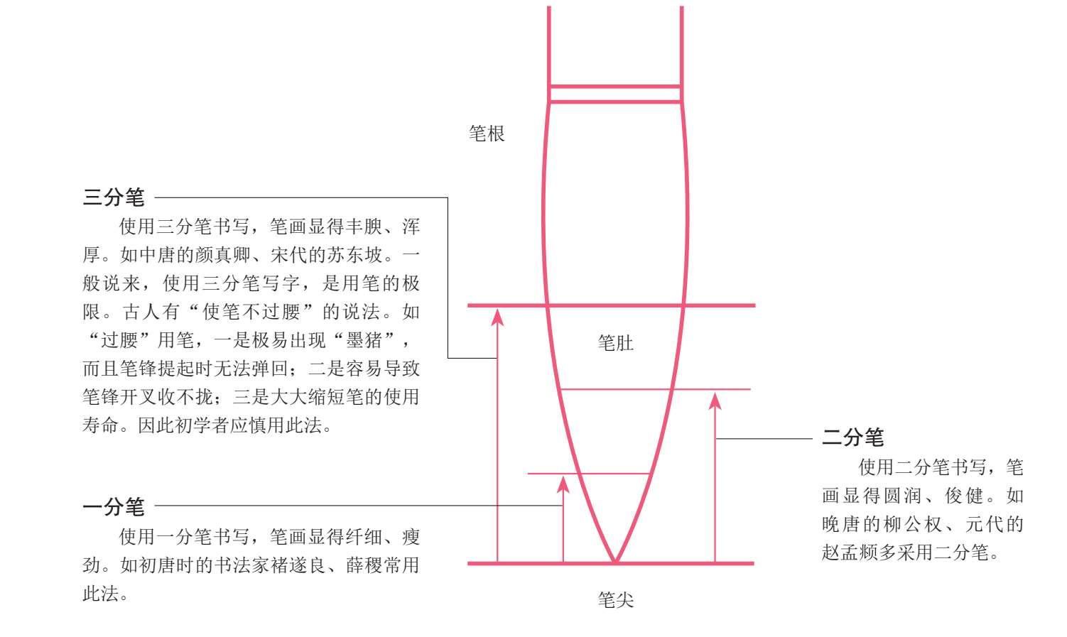 笔头深浅的尺寸,叫“笔位”。依笔头深浅可分为三断:笔端处,叫“一分笔”;笔腰处,叫“二分笔”;笔根处,叫“三分笔”。这种划分乃前人之经验,其目的是书写用笔时有准绳可循。一般地说,运笔不能超过笔腰,尤其是初学者在写楷书,或者写篆书、隶书时,应使用一分半至二分为佳,这样,行笔顿挫、提按便于笔力贯注,得势自然。书写时不应将根部用上,如果用到根部,会造成点画过多。但也不能仅用笔尖,否则,字会显得无力、轻飘。