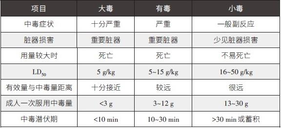 一般认为:“大毒”的药,使用剂量很小即可引起中毒,中毒症状发生快而且严重,易造成死亡;“有毒”的药,使用剂量较大才引起中毒,中毒症状虽发生较慢,但比较严重,可能造成死亡;“小毒”的药,在治疗剂量的情况下不容易发生中毒,只有超大剂量才会发生中毒,中毒症状轻微,不易造成死亡。