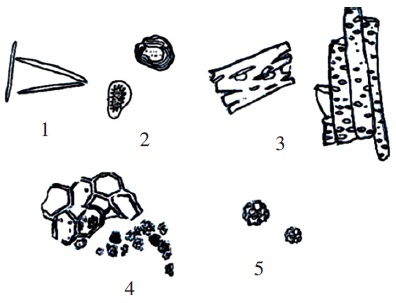 1.纤维 2.石细胞 3.导管 4.木栓细胞 5.草酸钙簇晶