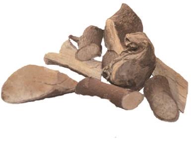 ◆粉末特征 本品粉末淡黄棕色。淀粉粒众多,单粒,圆形、长圆形、卵圆形、三角形及不规则形,直径7.5~25µm,脐点点状、人字状、裂缝状、复粒2~4分粒相聚。黏液细胞黄棕色,圆形、椭圆形,直径25~62µm。纤维众多,无色,有分枝,直径20~25µm,壁薄。导管具缘纹孔,直径37~70µm。可见木栓细胞碎片。