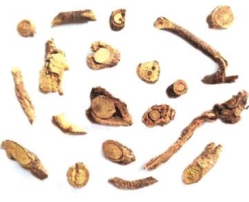 ◆饮片性状 本品为不规则的类圆形厚片。外表皮棕色至棕褐色。切面皮部浅棕色,木部淡黄色。有豆腥气,味极苦。