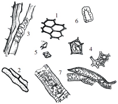 1.木栓细胞 2.木薄壁细胞 3.晶纤维 4.含晶厚壁细胞 5.草酸钙方晶 6.石细胞 7.导管