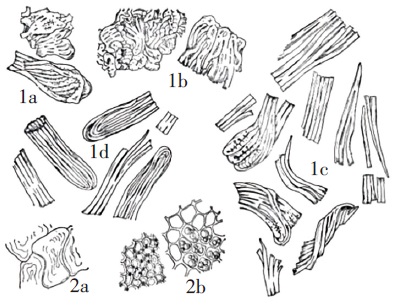 1.非腺毛(a.基部b.底面观c.中部裂片d.顶端) 2.内胚乳细胞(a.示内含物及胞间连系b.示壁极厚)