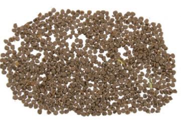 ◆药材性状 本品呈类扁肾形或扁卵形,直径约1mm。表面棕黄色或灰黄色,有细密的网纹,略尖的一端有点状种脐。切面灰白色,油质,有胚乳,胚弯曲。气微,味微辛。