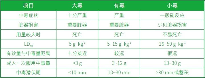 一般认为:“大毒”的药,使用剂量很小即可引起中毒,中毒症状发生快而且严重,易造成死亡;“有毒”的药,使用剂量较大才会引起中毒,中毒症状虽发生较慢,但比较严重,可能造成死亡;“小毒”的药,在治疗剂量的情况下不容易发生中毒,只有超大剂量才会发生中毒,中毒症状轻微,不易造成死亡。