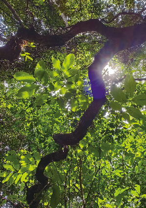 山谷清凉处,蝴蝶在树冠上活动,人在下面只能偶尔看见翅膀闪过