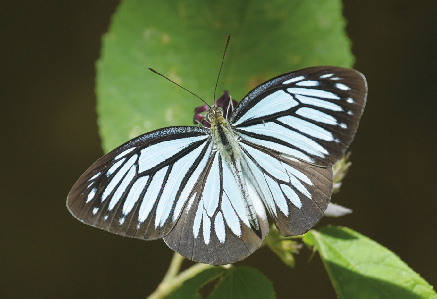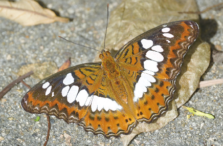 据蝶友们介绍,柱菲蛱蝶分布窄,海南容易见到,果然,我也是在霸王岭才一睹真容。仔细观赏了一下,只见它前翅中室的白色棒纹,像被刀劈一般整齐断开,被劈下的尖头还飞得挺远的,实在有趣。