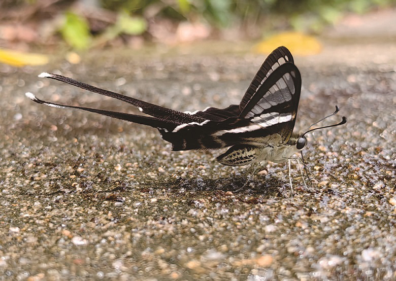 远远看过去,泼过水的地面已经半干,有一些小型蝴蝶弄蝶灰蝶之类。待到稍近,我不禁大喜过望——一只完好的燕凤蝶在那里快乐地抖动着尾巴,像骄傲的小公主。