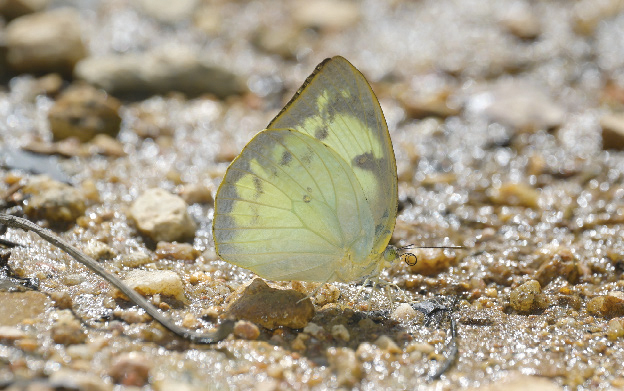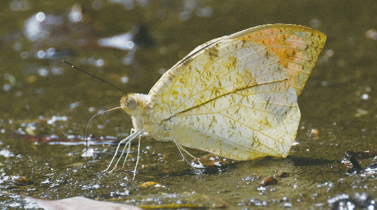 在一个路口,有一小堆砂石泡在水里,有好几只白翅尖粉蝶凑在一起汲水。这种粉蝶,其实在此之前我见到过几次,但都有点残破,唯有这一只称得上十成新,应该是羽化不久的。初生牛犊不怕虎,其他的同伴都被我的脚步惊飞了,它仍然泰然自若地继续大吃大喝。