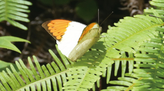 到它下面后,我高高举起相机,利用相机翻转屏作参考,终于拍到几张清楚的照片。我立即回放研究,发现它的反面和我在云南看到的区别挺大,记得看过一个资料,说红翅尖粉蝶有好几个亚种,看来,我碰到海南亚种了。