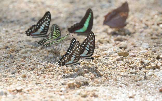我对蝴蝶更敏感,刚走几步,就叫停了前面的人。就在路边的潮湿处,一只绿带燕凤蝶正在汲水。