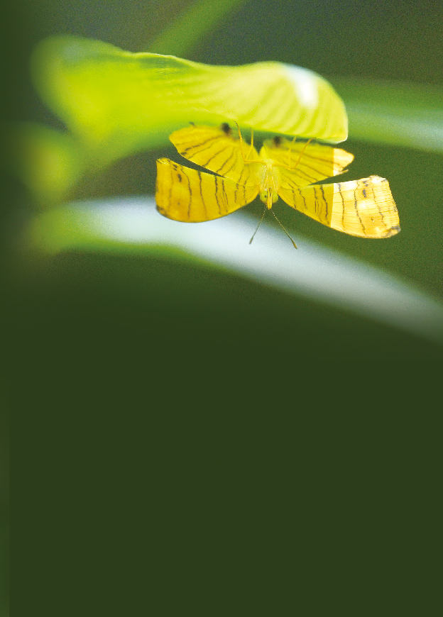 鹤顶粉蝶翅膀闭合时深藏锦绣,形如枯叶,但它一旦开翅,就会露出翅角耀眼的橙红来。它飞起来的时候,那团橙红一闪一闪,好看极了。