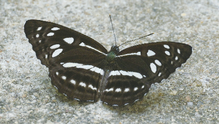 据蝶友们介绍,柱菲蛱蝶分布窄,海南容易见到,果然,我也是在霸王岭才一睹真容。仔细观赏了一下,只见它前翅中室的白色棒纹,像被刀劈一般整齐断开,被劈下的尖头还飞得挺远的,实在有趣。