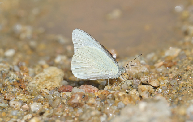在一个路口,有一小堆砂石泡在水里,有好几只白翅尖粉蝶凑在一起汲水。这种粉蝶,其实在此之前我见到过几次,但都有点残破,唯有这一只称得上十成新,应该是羽化不久的。初生牛犊不怕虎,其他的同伴都被我的脚步惊飞了,它仍然泰然自若地继续大吃大喝。