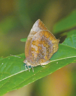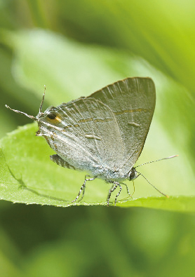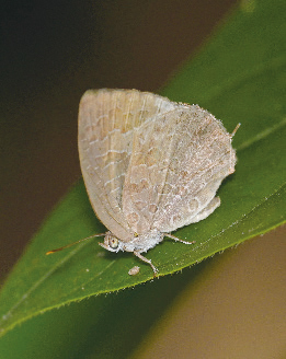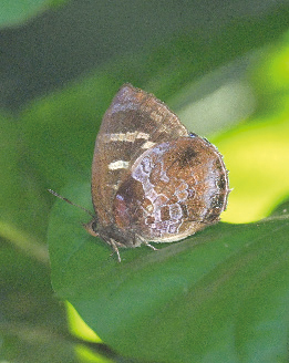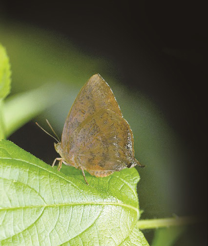 一只硕大的灰蝶,侧停在路边的灌木上,反面旧暗,后翅除了尾突还有一明显突起。我想起在网上见过,名为昴灰蝶,不过网上的反面多为棕色,我分析眼前这只略有差异的很可能是昴灰蝶海南亚种。昴灰蝶的资料极少,无法查对,只有先记录再说。
