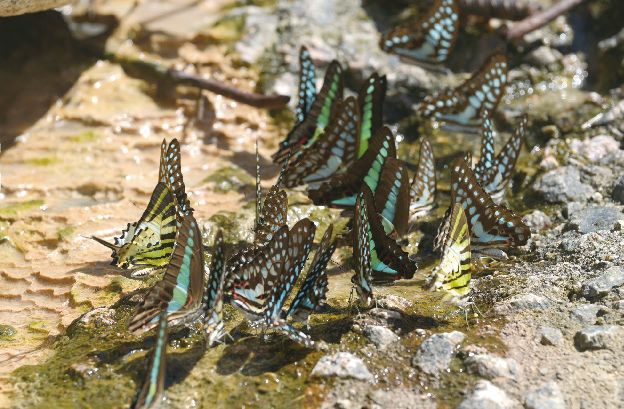 到了坝前,我眼前一亮,阳光下、阴影中都有蝶群,最下方的凤蝶群最为精彩,被我惊动后仍有近30只聚集在流水处,主要是青凤蝶和绿凤蝶,也有形似斑粉蝶的蝴蝶在附近绕飞。