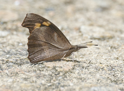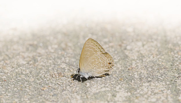 一只灰蝶在前面扑扇着,停在了路的中央。看着像一只雅灰蝶,我就没有停下脚步,近到完全能看清楚时,才发现它的前翅尖角形,是热带有的尖角灰蝶。