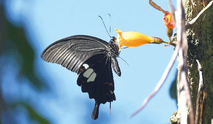 车刚开出几百米,就停下了。在我们的左边,一棵高大的火烧花树沐浴在晨光中,犹如一团闪烁着金黄光芒的朝霞。虽然比不上盛花期,但紧贴着树干开放的火烧花仍像燃烧的火苗,与晨光交相辉映,灿烂无比。在这彩色云团的边缘,有好几只玉斑凤蝶、美凤蝶、宽带凤蝶来回飞舞,兴奋异常地吸着花蜜。接近云端的华丽餐桌,色彩拉满的氛围感,换做谁都会兴奋。