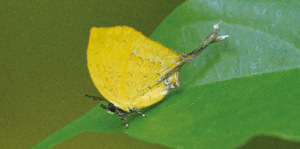 它没让我久等,很快就在树叶上停下来了。这一次彻底看清楚了,除了翅膀是黄色,其他部位都是黑白两色的组合,原来是三点桠灰蝶。