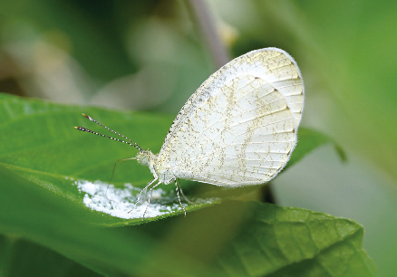 突然,这看似没有尽头的较劲儿状态改变了,它没有先兆地落在一片树叶上,一动不动。我靠近一看,是树叶上的鸟粪吸引住了它。终于可以看清了,竖着翅膀的它反面有着淡绿色的浅斑纹,果然是纤粉蝶——中国境内已知最小的粉蝶。