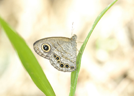 在小道尽头的草丛里,几只蛇眼蛱蝶仿佛在测试阳光的强度,它们从浓荫下追逐而出,在草丛中平摊开翅膀,然后又各自退回浓荫下。经历短暂阳光烧烤之后的它们,都少见地竖起了翅膀,我不会错过这样的机会,急按相机快门。其他时候,很难拍到这种蝴蝶的反面。