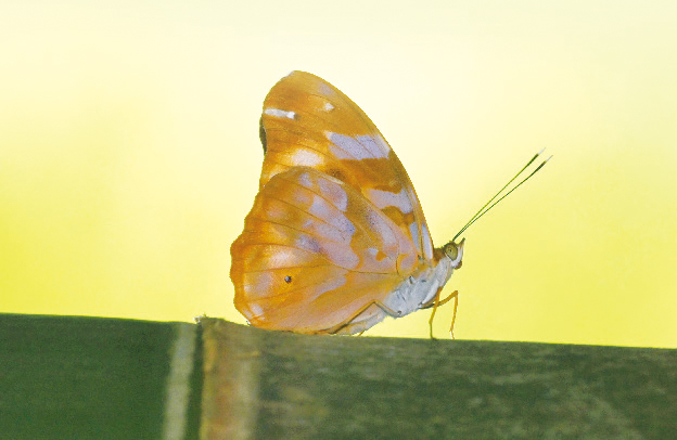 突然,一只黄色蝴蝶从路边的灌木上蹿起,在前方更高的灌木上停住了,我有点激动地停下脚步,它蹿起的瞬间,我看见了它前翅的橙黄色条斑——这是爻蛱蝶啊,野外极难见到的。