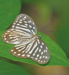 是它!黑褐色的翅膀上,布满类似斑蝶或脉蛱蝶的黄白色条纹,后翅的条纹都对应着斑点。我高兴得原地使劲跺了两下脚。