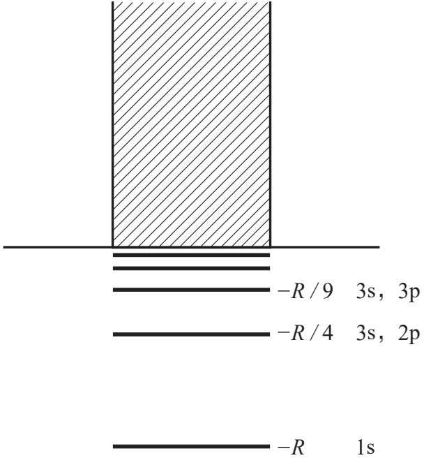 此处我们可以定性地讨论一下氢原子和类氢原子的能谱图像:如图8,阴影部分表示连续谱,能级是连续的。我们还可以讨论它们的能级简并性质。