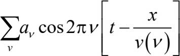 如果所有的 a ν > 0,叠加波在 x =0和 t =0时为主极大。现在若要确定任意 t ≠0时波包的位置,只需要确定其极大值的坐标即可。波包处于极大值处要求