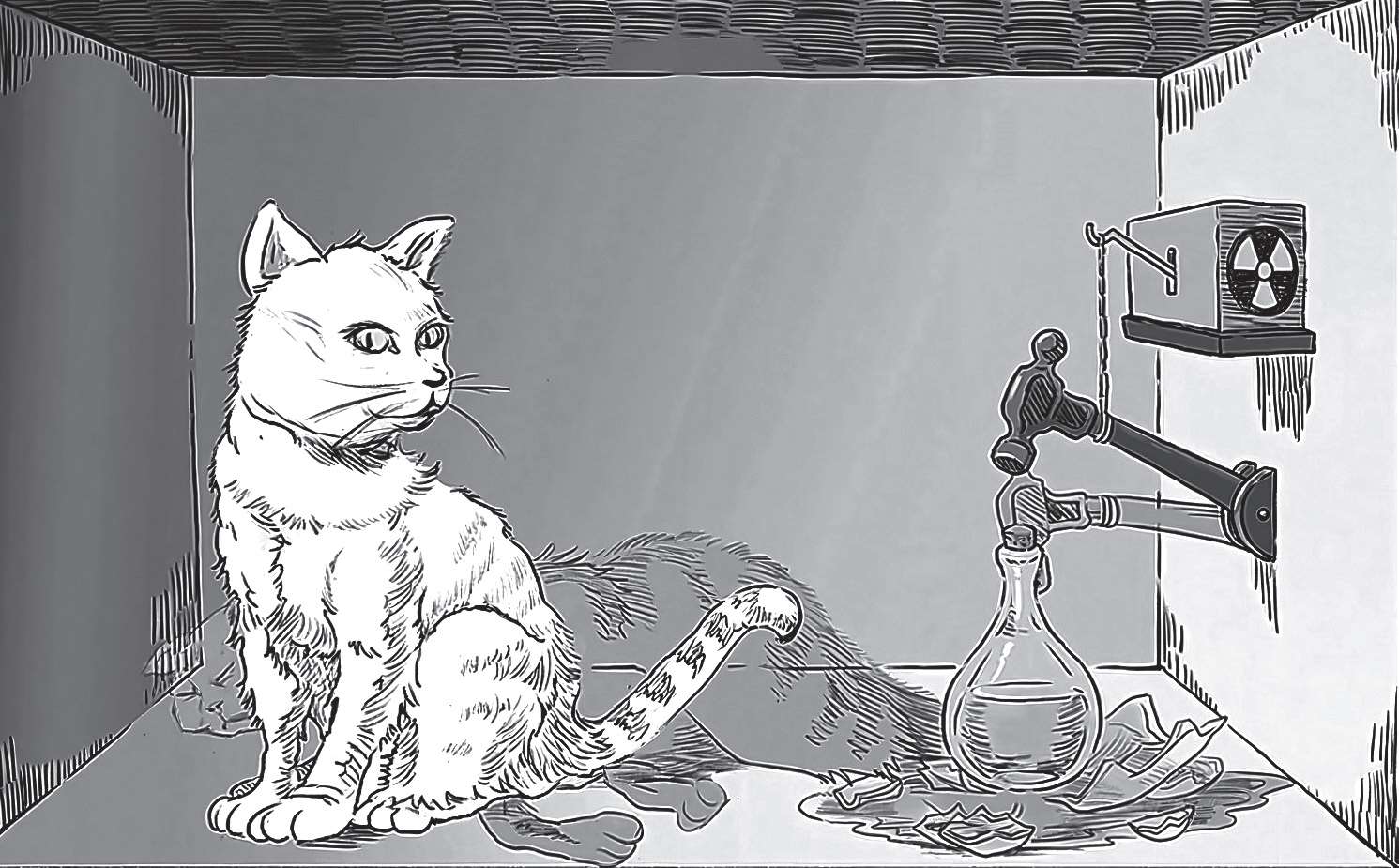 “薛定谔的猫”是由奥地利物理学家埃尔温·薛定谔提出的思想实验。实验假设一只猫被放在一个装有少量镭和氰化物的密闭容器里。如果镭衰变,氰化物会被释放,猫就会死亡。根据量子力学理论,由于镭处于衰变和没有衰变两种状态的叠加,猫也理应处于无法观测到的生与死的叠加态。这个实验不是为了描述实际情况,而是用来说明量子力学在理论和实践中的一些难题,特别是与测量和观察者效应相关的问题。图为“薛定谔的猫”实验示意图。