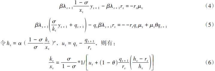 其中:λ t 为预算约束下的拉格朗日乘数,μ t 为信贷约束下的拉格朗日乘数,h t t为高效率企业的收益率;u t 表示的是资本所有者t期提前收取的租金,即资产持有的机会成本。公式(6)说明了高效率企业的固定资产投入与劳动力投入之比等于固定资产投入份额乘以资产持有的机会成本加上自有资本相对价值变化与收益率变化之积的倒数。