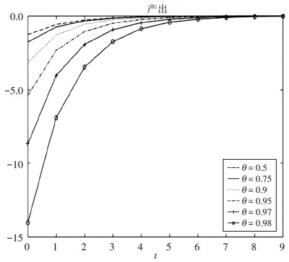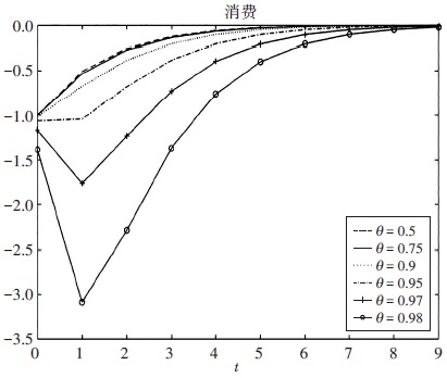 图4中显示了生产率冲击后,在不同金融发展取值下产出相对于稳态的偏差百分比。金融发展为0.5时,一个标准差单位的负向技术冲击导致产出当期同幅度下降后逐步回升到稳态水平,图5中消费当期同幅度下降后逐步回升到稳态水平。随着金融发展的取值增大,产出偏离的程度也在提高。当θ为0.97时,产出当期大幅度下降,之后逐步回升到稳态水平,消费当期同样大幅度下降后逐步回升到稳态水平,总产出、总消费以及总财富的偏离路径模式几乎是相同的。可见,金融发展程度越高,经济体受到的冲击最大,波动幅度也越大。