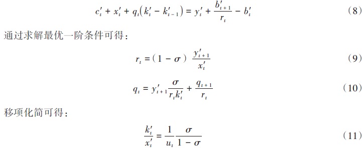 其中:r t 为利率水平。方程左侧为支出项,q t (k t -k t -1 )为新增固定资产支出,方程右侧为收入项,即产出加上获得贷款的现值减去当期的债务偿还。