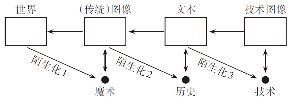 “陌生化”(一种疏离并跃出的能力)是实现媒介更替与人类的知觉能力升级的动力源泉。陌生化使人类从自然(四维的时空连续体)中跃出,实现首次“成为人”,进而开始创造“人为的”非自然世界。图像的世界(二维的平面世界)由此诞生,图像开始指示世界:人们具有了将四维的世界转变为二维图像的能力,并能够将二维图像还原为世界的能力。但图像的指示能力变成了偶像崇拜之时,第二次“陌生化”随之发动,人类传播进入文本世界(一维的线性世界),以救赎迷恋图像而疯狂的人类。当文字理性逐渐走向工具理性,科学崇拜使文本具有高度抽象性与不透明性,文本也丧失了指示世界的能力,如此第三次“陌生化”开始发动,人类进入技术图像的世界(0维的点世界),为的是通过图像的二次“魔法(魔术)化”,战胜历史的危机,从而救赎文字理性(现代性)。这就是弗卢塞尔借用图像理论提出的纠偏“现代性”的方案。同时,人类传播在“43210”的维度变化中不断发展“抽象能力”,一步步从现实开始抽象化地后退,最终“进入技术图像的宇宙”。