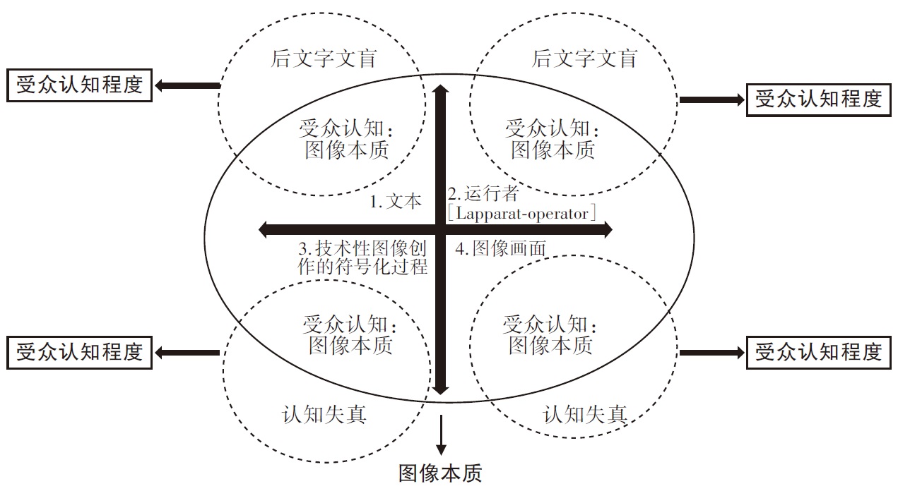 图3以电影图像的传播过程为例,示意认知失真现象的产生逻辑。对于图像传播的实践来说,文本、运行者(机器操作者)、技术性图像创作的符号化过程以及图像画面共同构成了电影图像本质的四大维度。四周环绕的圆形结构表示受众对图像理解的程度,当受众的认知范围未全部覆盖图像本质的四个象限时,认知失真(后文字文盲)现象随即产生。